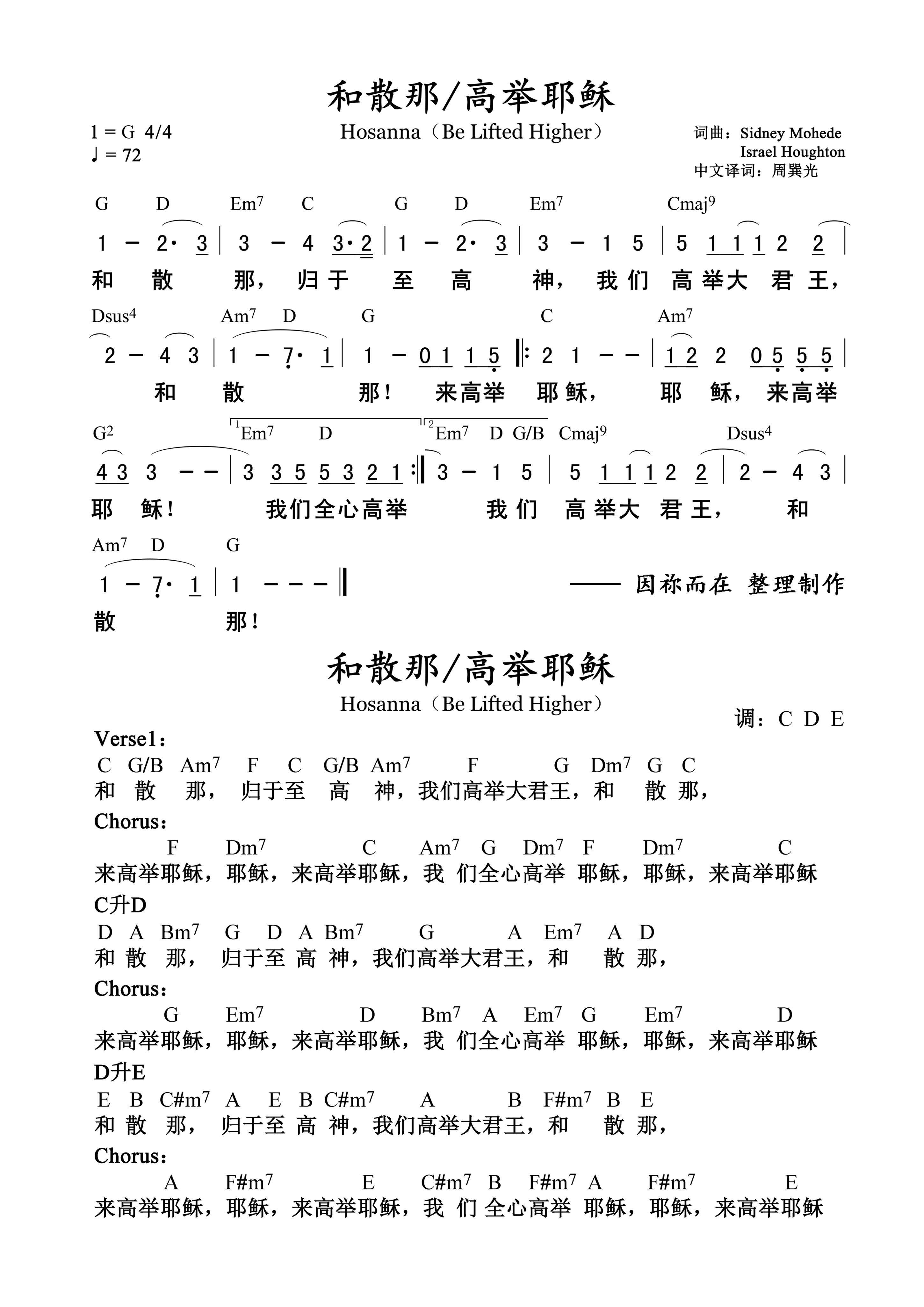 和散那/高举耶稣(和弦简谱+吉他谱)
